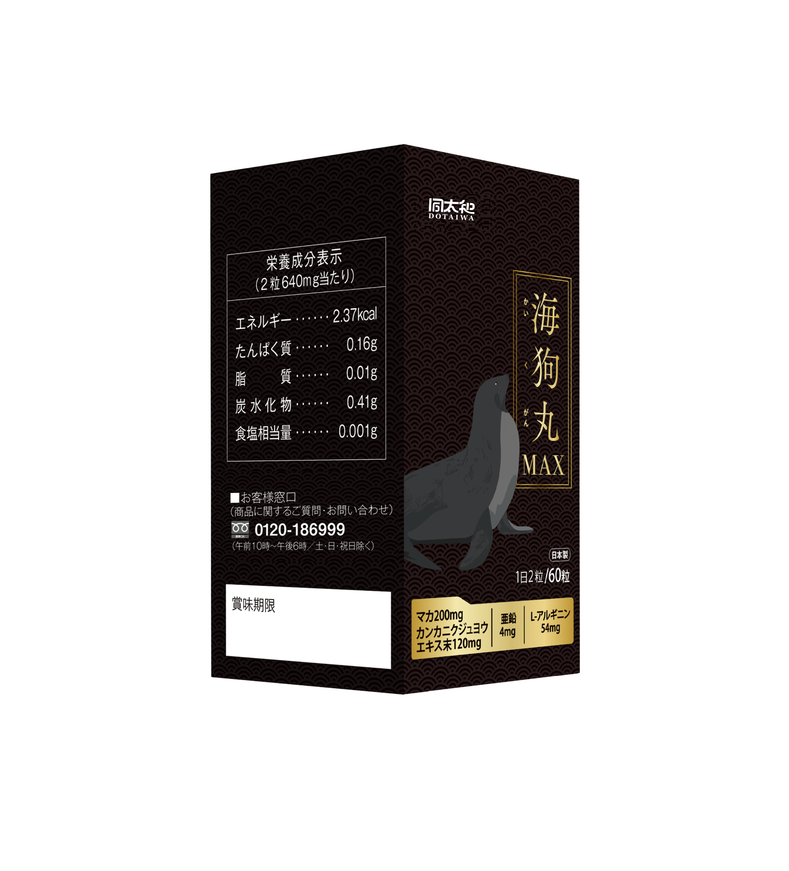 そこで、当社がおすすめするのは、ペルー産ブラックマカ、日本産牡蠣エキス、L-アルギニン、亜鉛酵母、セレン酵母といった天然成分を絶妙なバランスで配合した海狗丸MAXです。