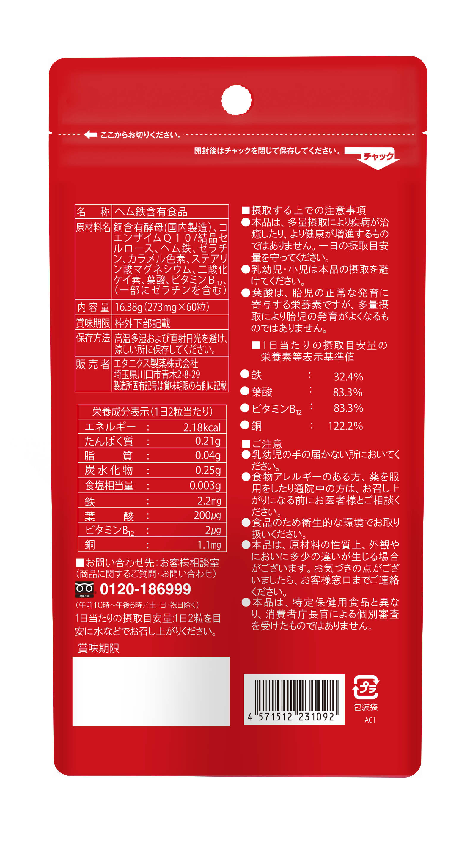 「本品にはヘム鉄が含まれており、食事から摂取した鉄分の吸収率を高め、貧血の改善に役立つ機能があります。貧血ケアは、食生活が偏っている方、貧血のリスクが高い方に適しています。」