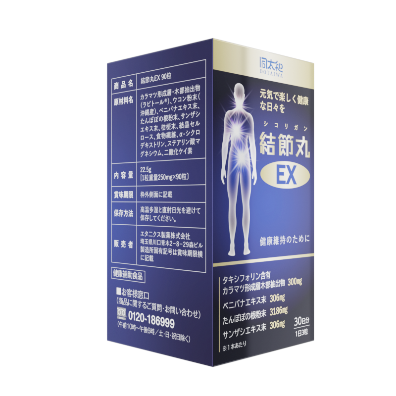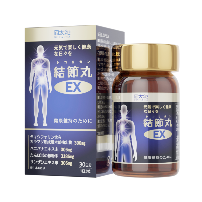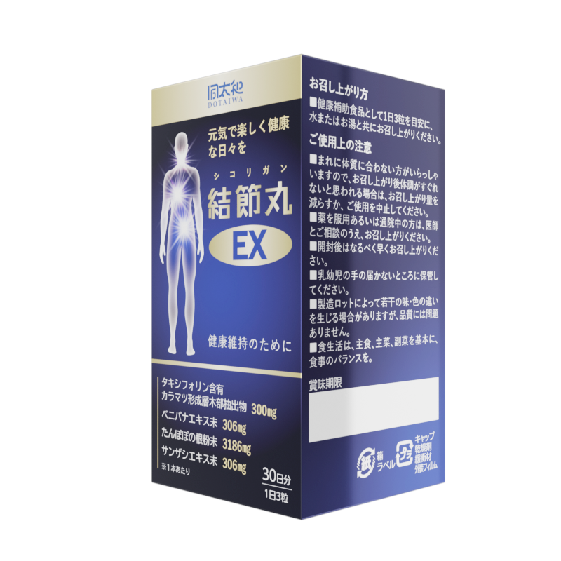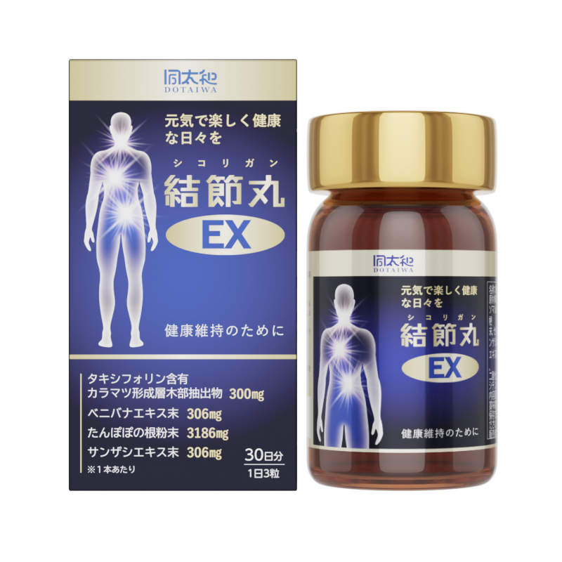 健康的で快適な体を目指したい方は、ぜひタキシフォリン含有カラマツ形成層・木部抽出物、ベニバナエキス末、タンポポ根粉末、サンザシエキス末を配合した結節丸EXをお試しください。