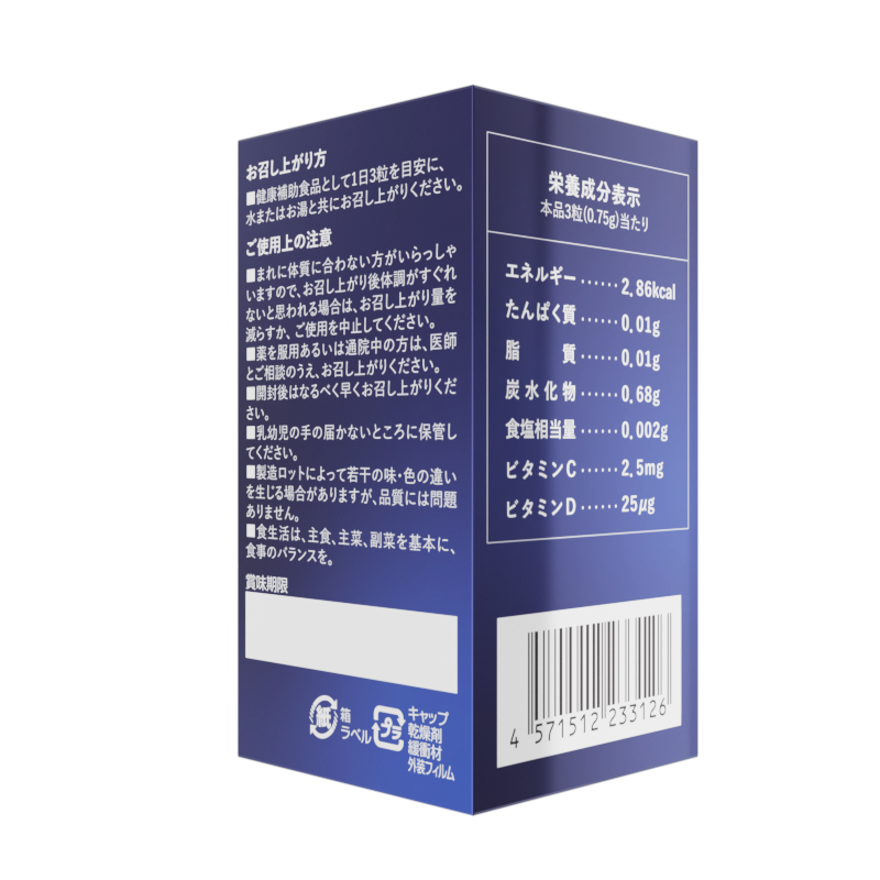 | 原材料名 | マルトース(国内製造) カラマツ形成層 秋ウコン粉末 インマルㇳ 桂皮末ペパーミント たんぽぽの根粉末 桔梗末 セイヨウキヅタ 乾燥エキス ベニバナエキス サンザシエキス末 カラマツ形成層木部抽出物 木部抽出物 ウコンエキス/結晶セルロース ステアリン酸マグネシウム 二酸化ケイ素 加工デンプン ビタミンC ヒマワリレシチン ビタミンD |