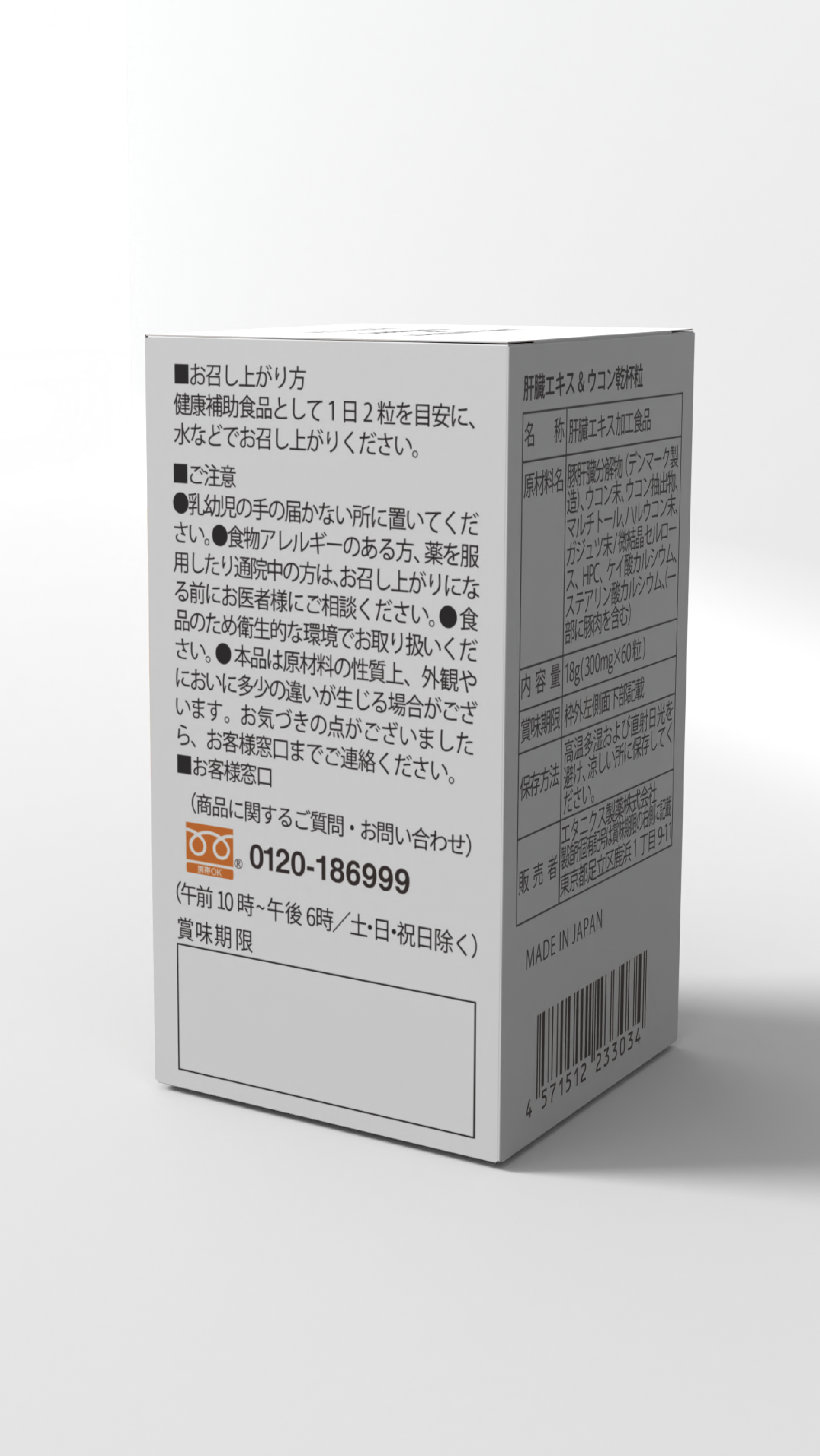 | 主要成分 | 肝臓エキス200mg 3種のウコン末180mg クルクミノイドとして36.7mg |